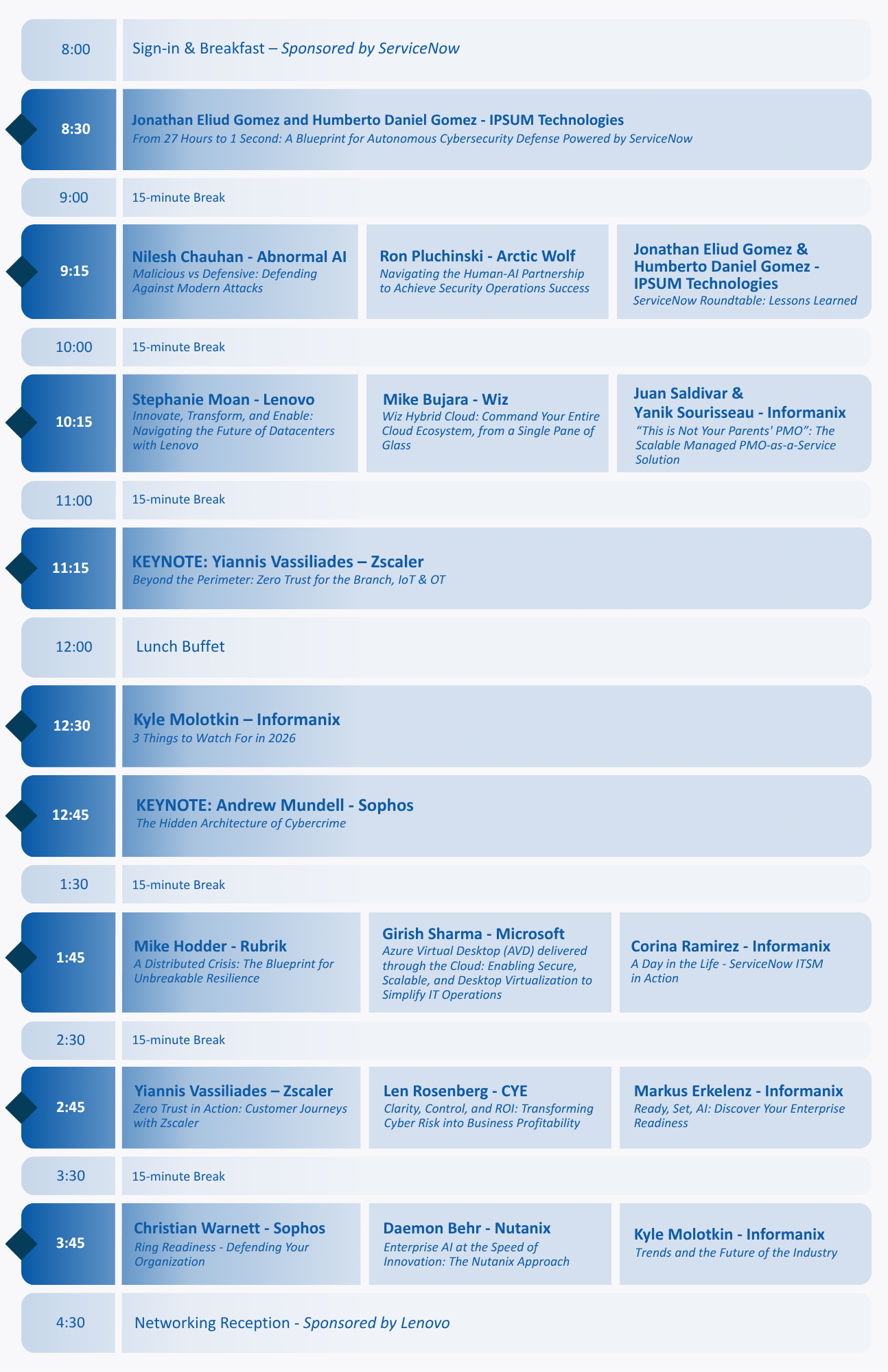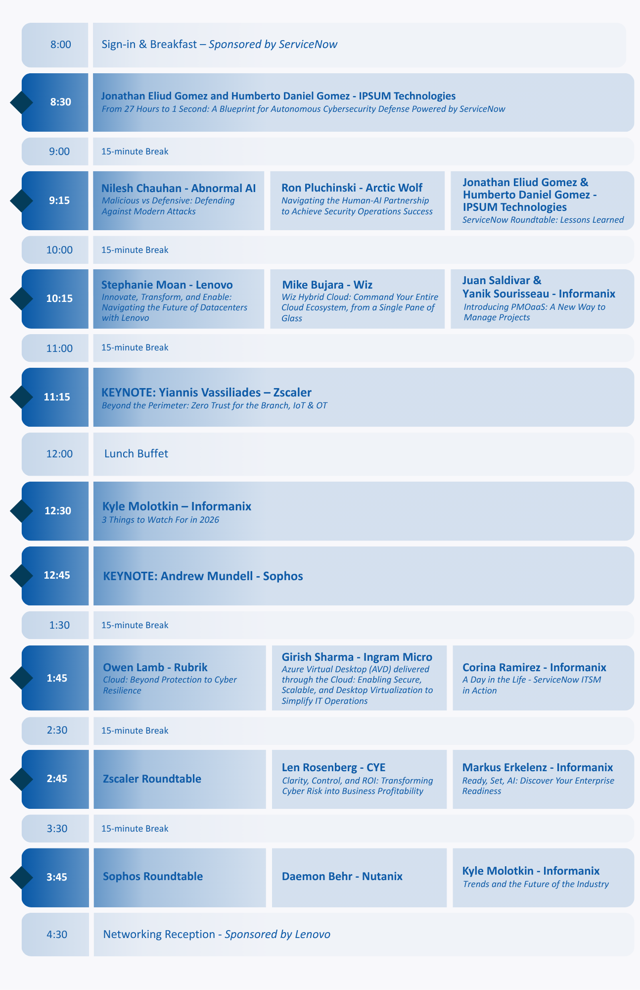 Join our breakfast keynote speakers Jonathan Eliud and Daniel Gomez from IPSUM Technology in Mexico City as they deep dive into how Banco Davivienda (Colombia's third largest bank) levered ServiceNow to transform its cybersecurity model from reactive to hyper-proactive. Learn how they moved from 300 to 15,000+ alerts/month, slashed incident resolution from over a day to just one second, and deployed a ‘SOCless’ architecture with automation, machine learning, and continuous workflows. For cybersecurity professionals and IT managers ready to evolve their SOC, this is your chance to see a blueprint for the future of autonomous cybersecurity defense.